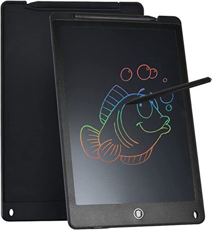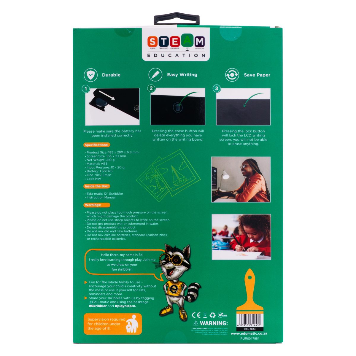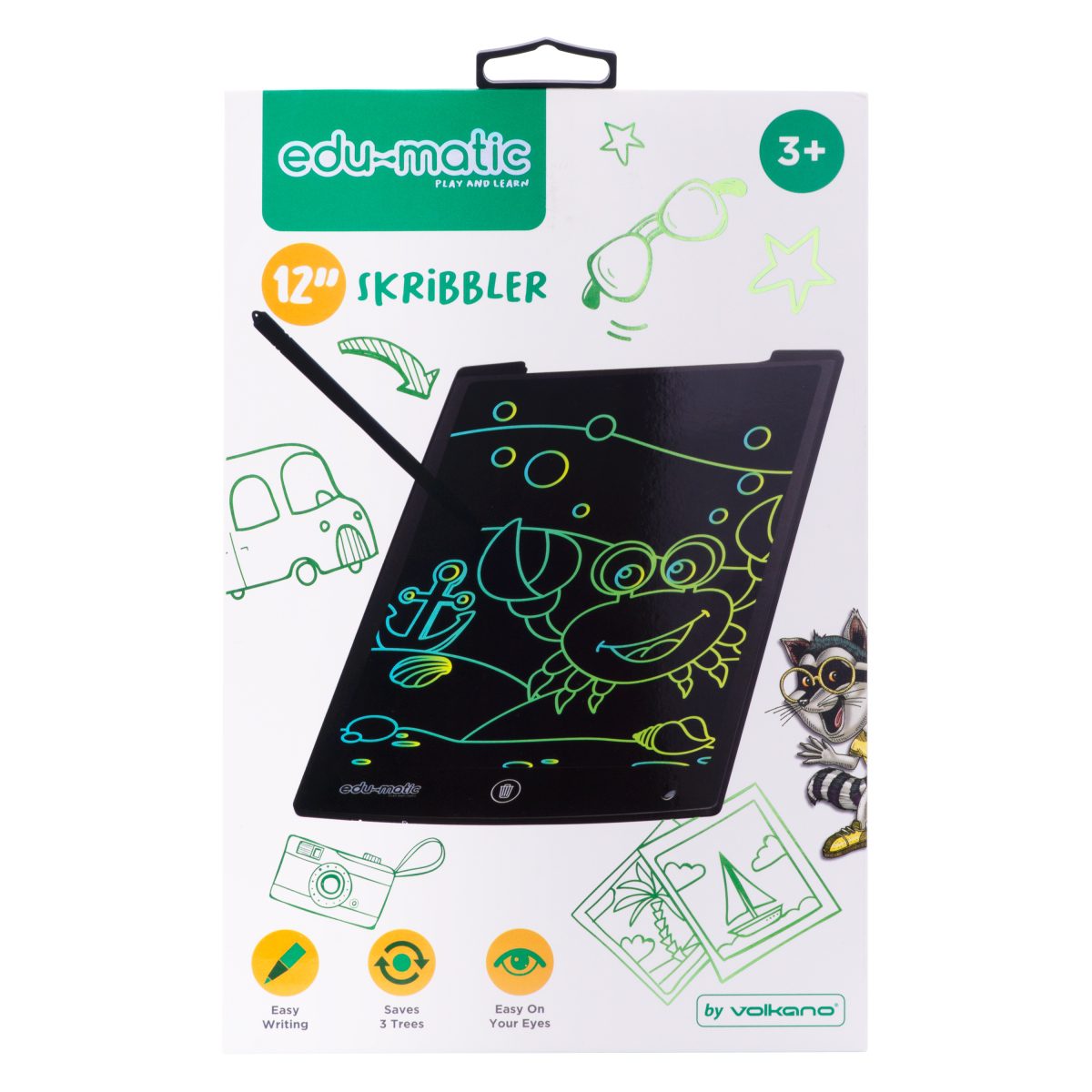 The Edu-matic Skribbler has a 12 inch LCD screen with one delete button. A writing pen is also provided.