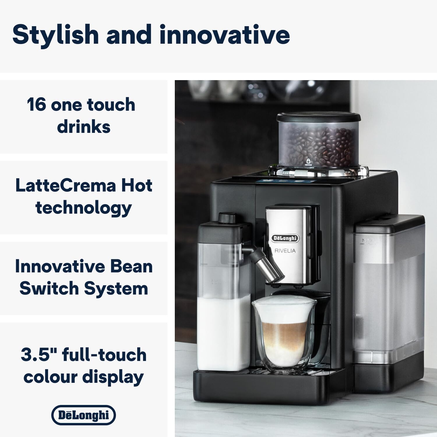 Immerse yourself in the world of coffee with Rivelia. Explore infinite bean varieties with Bean Switch System, enjoy an immersive experience with a 3.5" full-touch colour display, with rich animations and coffee routines tailored to you. Top your milk-based drinks with fine rich foam using LatteCrema Hot Technology, in a compact machine that fits your style.