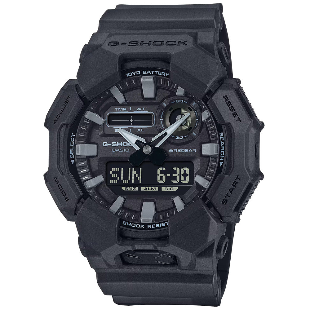 ANALOG-DIGITAL GA-010 SERIES GA-010-1A1 The analog-digital GA-010 delivers handy features like world time and stopwatch, as well as a high-brightness LED light, which can be easily accessed from the large button on front of the case, ensuring visibility even in the dark. Made with bio-based resin and equipped with a...