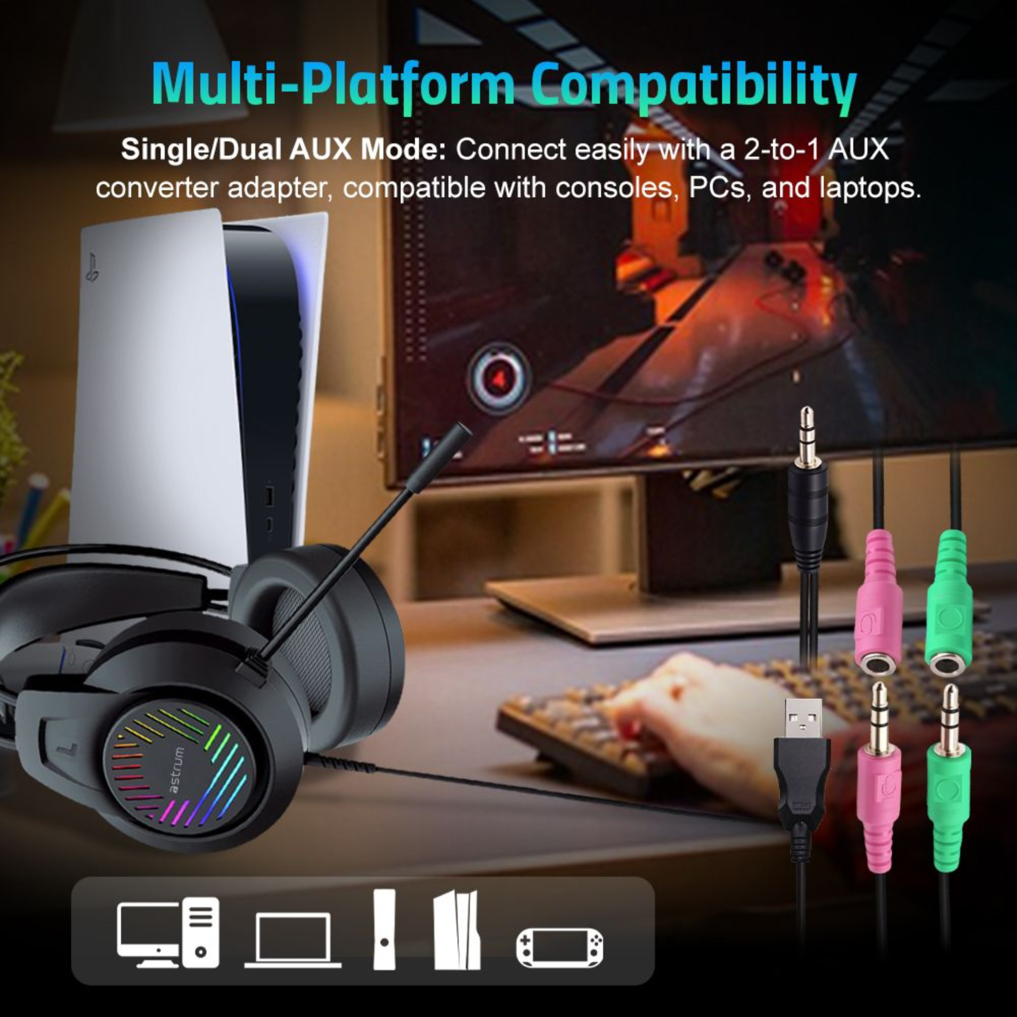 Astrum HG100 Wired Gaming Headset, 2 x 3.5mm with Boom Mic and USB LED
