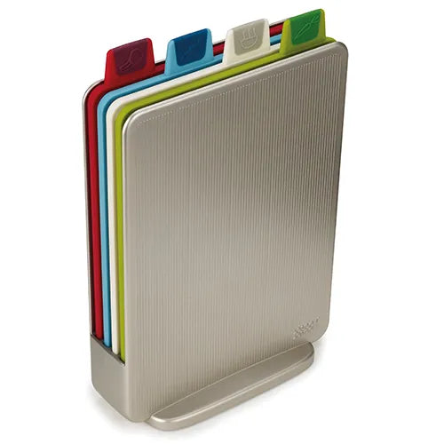 Joseph Joseph Index Mini Chopping Board Set Silver This simple and compact Index Mini Colour-coded Chopping Board Set is ideal for avoiding cross contamination at home whilst preparing food. Ideal for space-saving in its storage case and index style tabs indicate the food type for each board. All boards are...