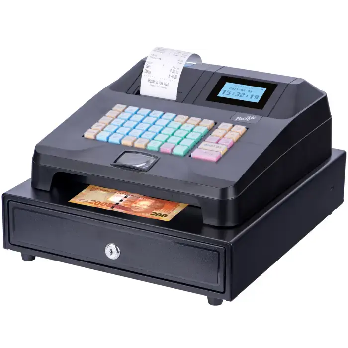 Product Specifications 10 000 Price look-ups (PLUs) with barcode scanning Built-In rear customer LED display Easy viewing operator LCD with large-format 18 Fast selling Dept keys (Shift to 36) 200 Departments 50 Clerks 9 Tax tables Pin code security feature (Manager & Clerks) 32 Characters fast thermal printer (58mm) Supports...