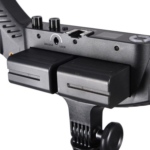 You can make colour and light intensity adjustments from 10 to 100% with two knobs on the fixture. The LR160 runs on AC power via its included adapter, but it can also be powered by two optional NP-F970 lithium-ion batteries in locations where mains power is unavailable.