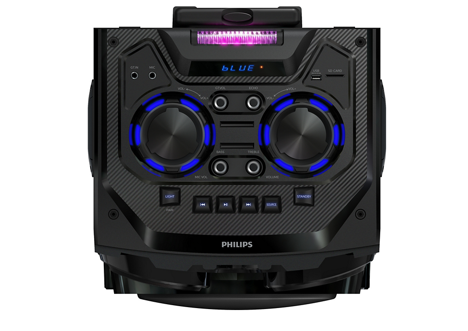 Bring the beats Bluetooth® USB, AUX, SD card, FM Karaoke and guitar fucntions Built-in battery Deep bass. Up to 12 hours play time With powerful sound and big, pumping bass, this karaoke speaker can fill the room with beats. The built-in battery lets you rock the party outdoors for up...