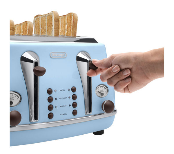 Delonghi CTI4003.AZ 4 Slice Toaster - Azure The skillfully modelled material speaks of solidity and class. Modern, unusual colours to captivate and amaze with style. The sophisticated matt metallic finish, with chrome-plated details, give Distinta collection an air of natural refinement. BROWNING CONTROLS Progressive electronic browning controls. CRUMB TRAY Removable...