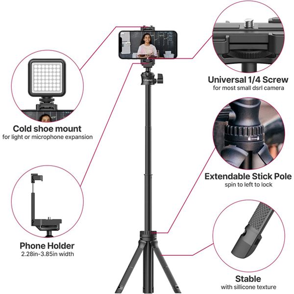 The MT-34 Multifunction Extendable Tripod from Ulanzi features a 2-in-1 phone clamp design. When folded, there is a 1/4" universal screw which can mount a camera directly. When stretched, it can be used as a phone clamp. The clamp width is from 58 to 98mm, which fits most smartphones on the market....