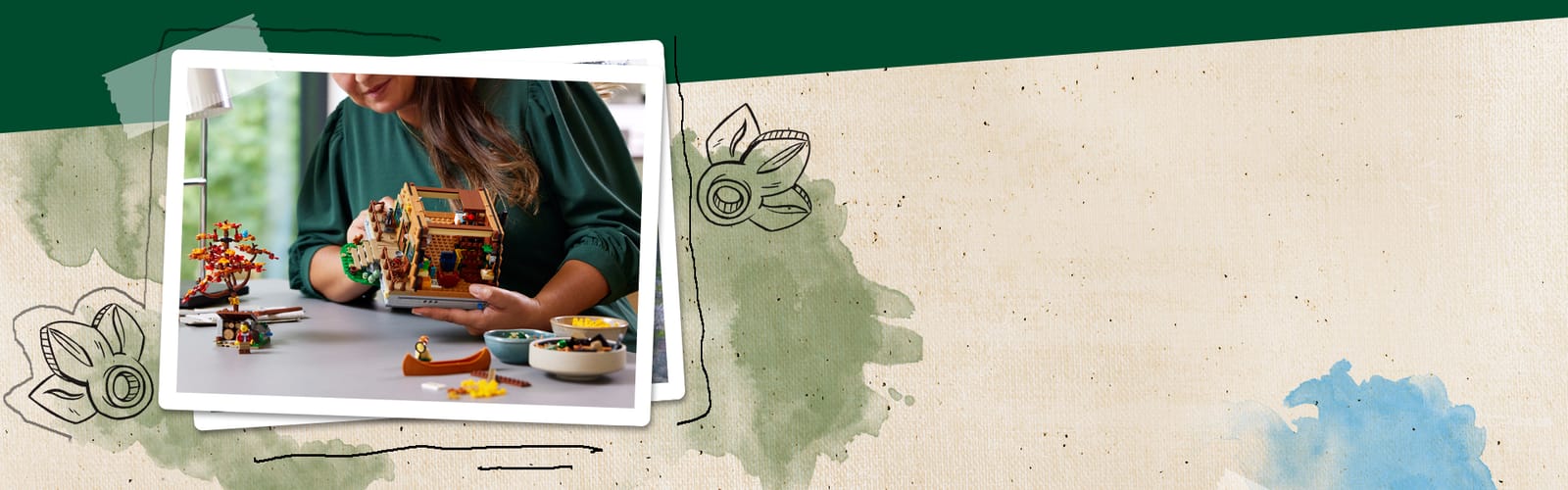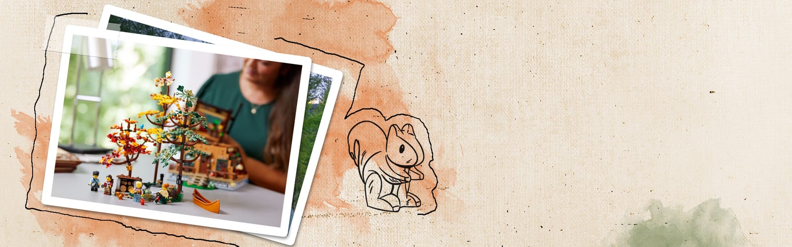 - 3 buildable trees and a canoe – Place the trees separately around the cabin or connect them to create a small island that the minifigures can reach using the canoe