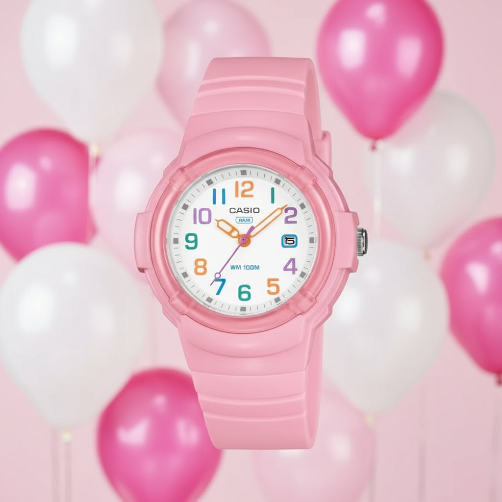Not just sweet, but serious, too, delivering water resistance up to 100 meters and a handy date display. The band is made with environmentally responsible bio-based resin.
