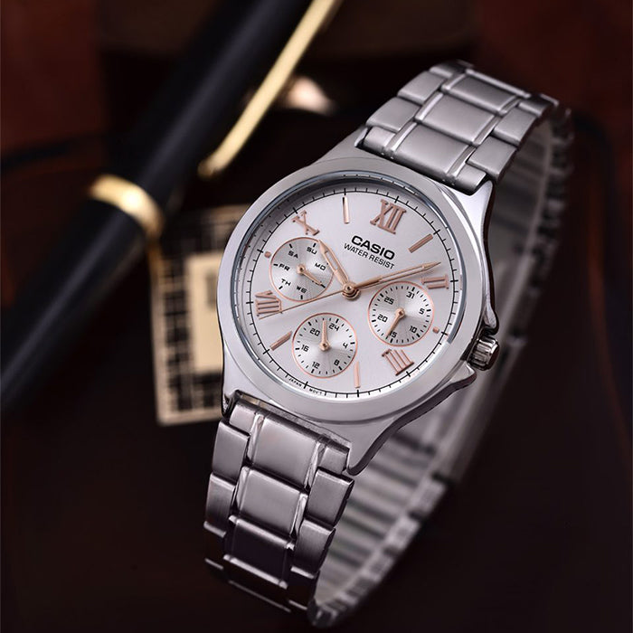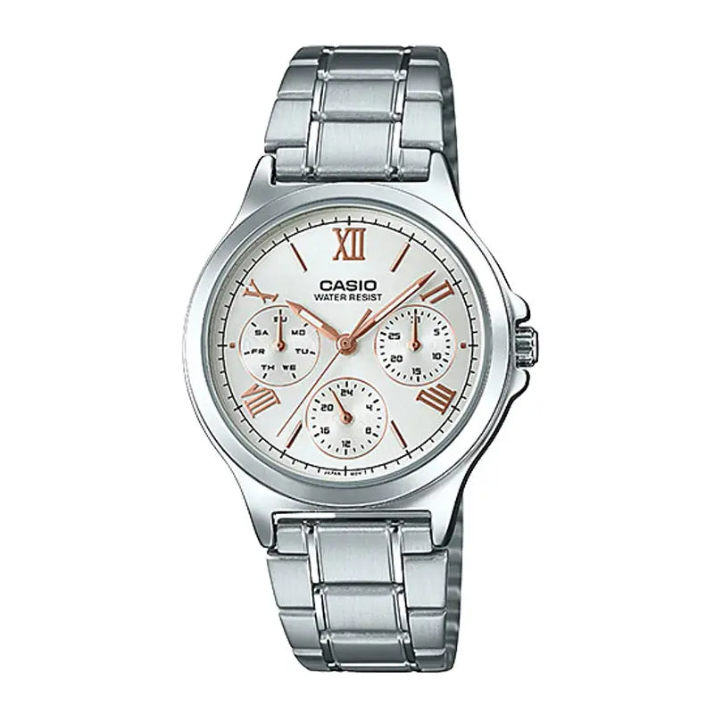 ENTICER WOMEN LTP-V300 series LTP-V300D-7A2 Casio is proud to present it's outstanding collection of Casio watches which fall under the standard collection range. These models are great value for money and are made with Casio's usual outstanding quality. Accuracy Accuracy: ±20 seconds per month Other features Regular timekeeping: Analog: 3...