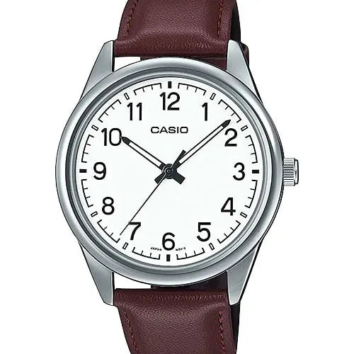Style yourself for work or play with the MTP-V005 line of Casio dress watches. The simple, clean design of the face makes it easy to be on time. These versatile timepieces are water resistant for daily use, freeing you from worry when out in the rain or washing up.