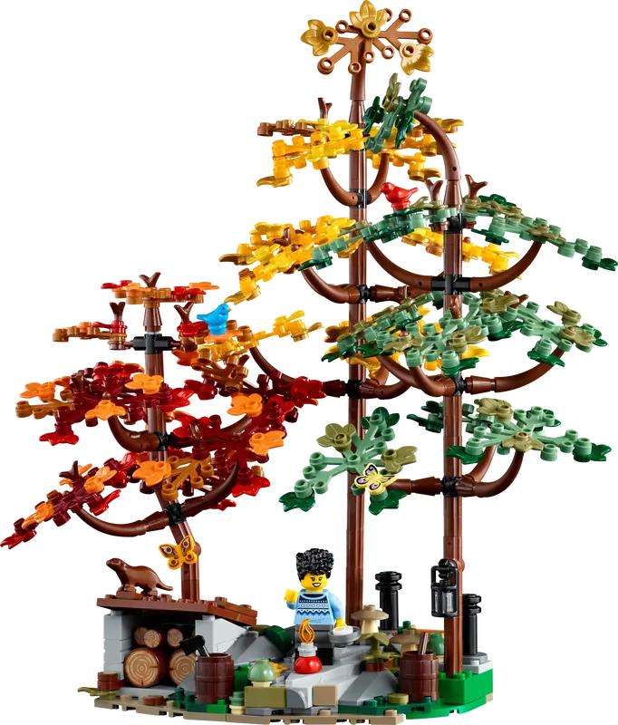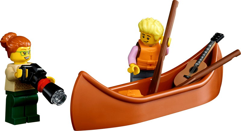 - 3 buildable trees and a canoe – Place the trees separately around the cabin or connect them to create a small island that the minifigures can reach using the canoe