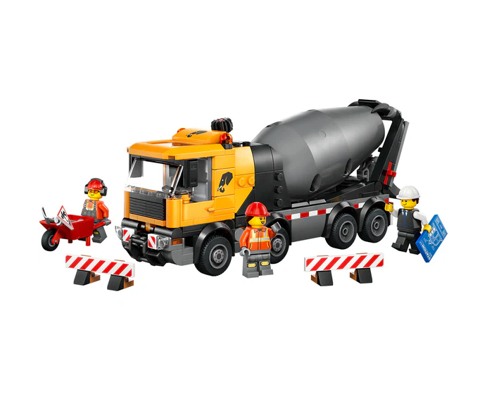 - LEGO® MINIFIGURE ACCESSORIES – This cement truck model comes with LEGO accessories including a wheelbarrow, road sign, 2 barriers, a clipboard, spade and broom