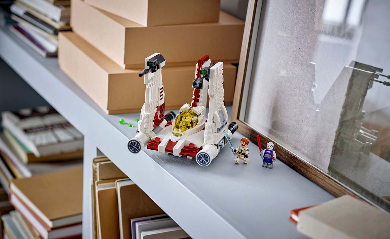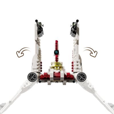 • LEGO® brick-built Star Wars™ starfighter – Features an opening cockpit, adjustable wings for flight and landing modes and 2 stud shooters for fantasy battle play