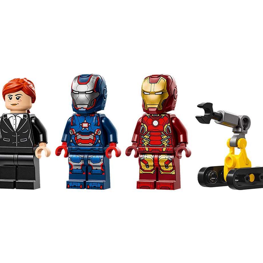 - Super Hero characters – Iron Patriot, MK43 and MK6 Iron Man armor, Pepper Potts and AldrichKillian minifigures, a buildable Dum-E robot and an MK3 mech with movable arms and legs and an opening cockpit