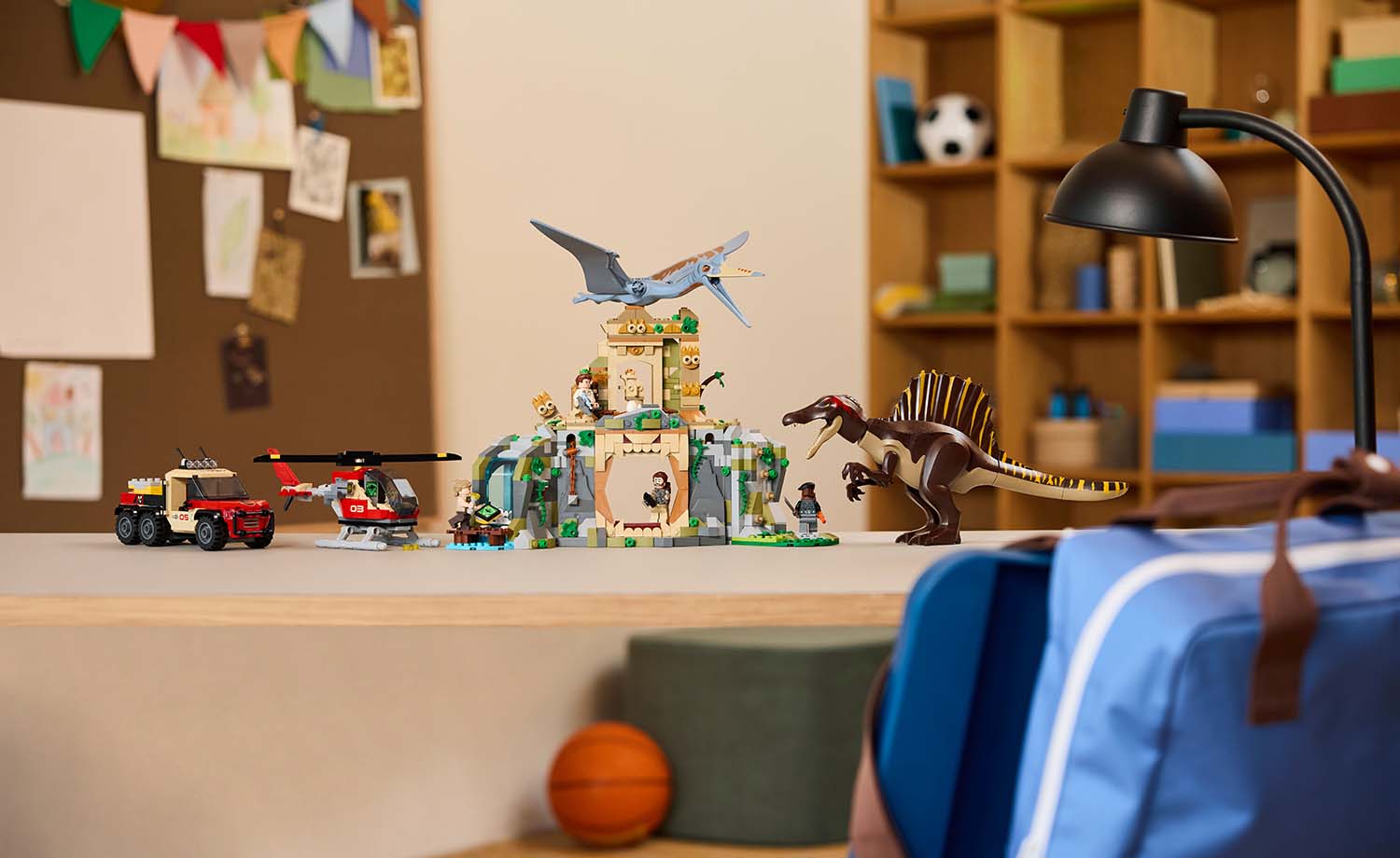 • Jurassic World Rebirth toys in a LEGO® box – Molded Spinosaurus and Quetzalcoatlus figures, 4 movie character minifigures, an ancient temple, a toy helicopter and dinosaur truck toy, plus lots of details