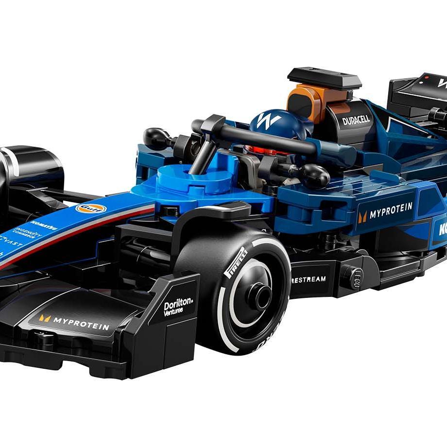The F1 model car features a cockpit that opens by lifting the halo bar, a rear wing, wishbone suspension, sponsor stickers and wider rear tires imprinted with “Pirelli.” The buildable F1 toy car also comes with a driver minifigure wearing a Williams Racing outfit and a winged helmet to place inside the cockpit.