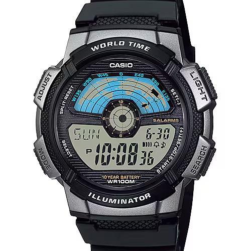 AE-1100 series AE-1100W-1AV World time Multi Time (4 different cities) World time 31 time zones (48 cities + coordinated universal time), daylight saving on/off, Home city/World time city swapping Stopwatch 1/100-second stopwatch Measuring capacity: 23:59'59.99'' Measuring modes: Elapsed time, split time, 1st-2nd place times Timer Countdown timer Measuring unit: 1/10...