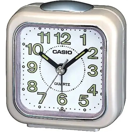 Table clock TQ-142-7 Alarm/hourly time signal Beeper sound alarm Light Micro-light Accuracy Accuracy: ±20 seconds per month Case size (L× W× H) 77 × 72 × 49 mm Weight 105 g Case material Case / bezel material: Resin Power supply and battery life Approx. battery life: 12 months on R6P...