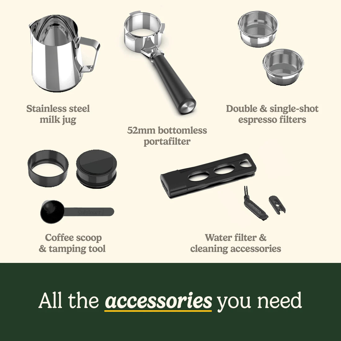 - Material: Plastic and stainless steel housing, stainless steel milk pitcher and portafilters