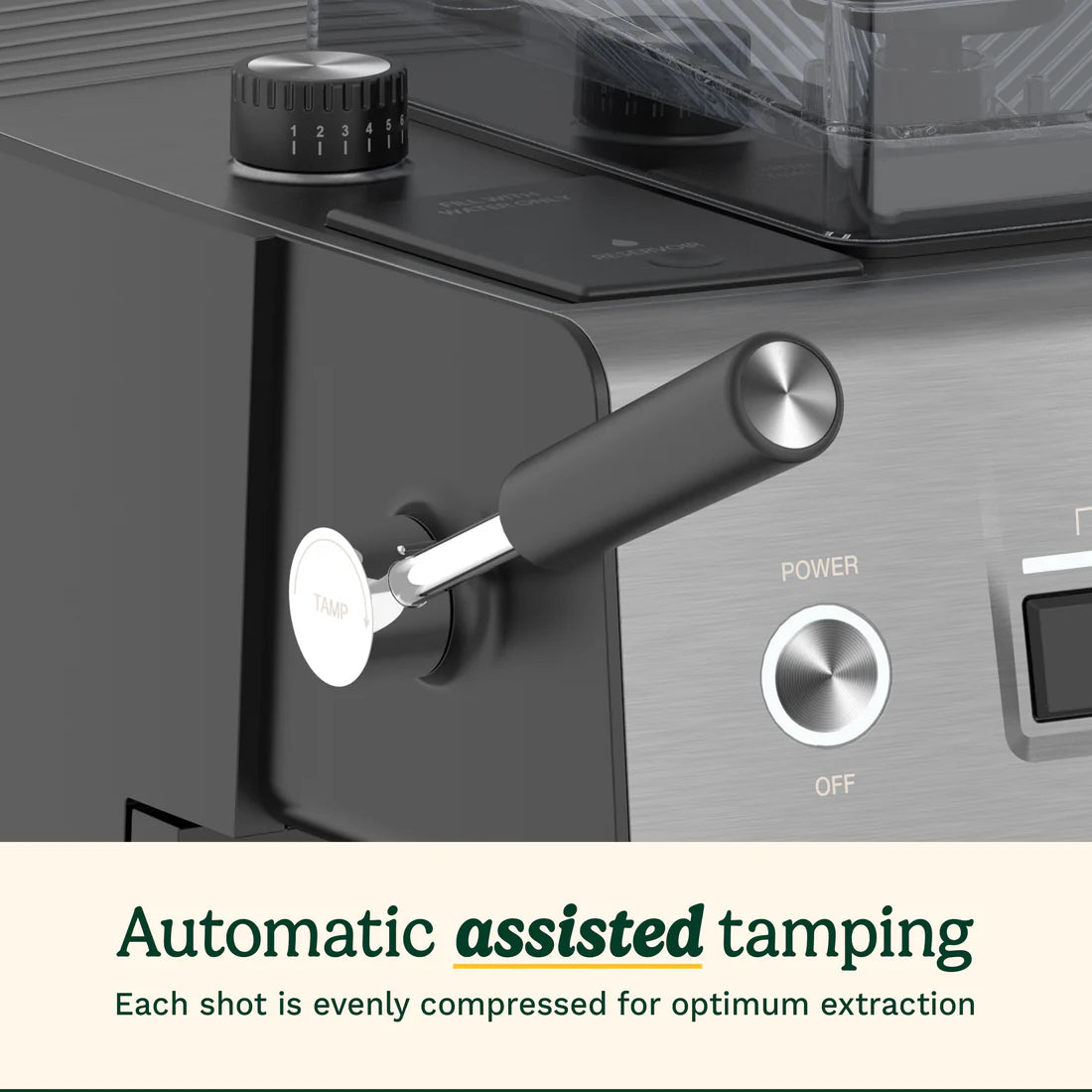 • Assisted tamping for consistent results: Did you know 10kg is the ideal tamping pressure? With automatic assisted tamping, each shot is evenly compressed. This ensures even extraction, rich crema, and bold flavour, while also being vital for optimal water flow.