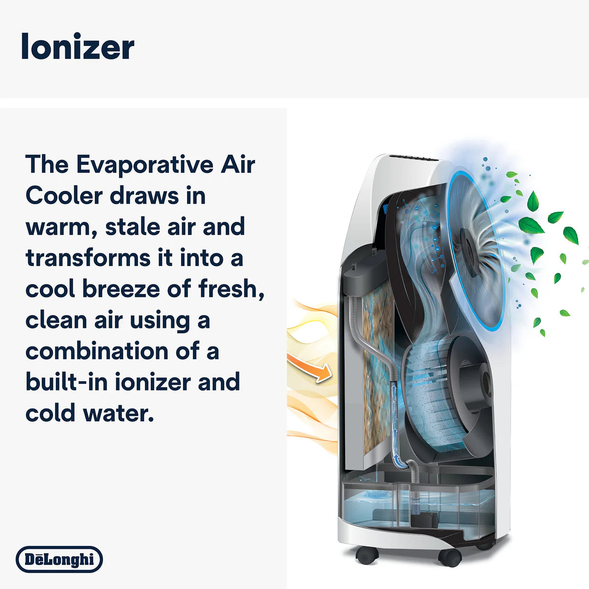 Delonghi - Evaporative Cooler - EV250.WH The EV250 Portable Evaporative Air Cooler draws in warm, stale air and transforms it into a cool breeze of fresh, clean air using a combination of a built-in ionizer and internal water chamber. You can even speed up the process with the help of...