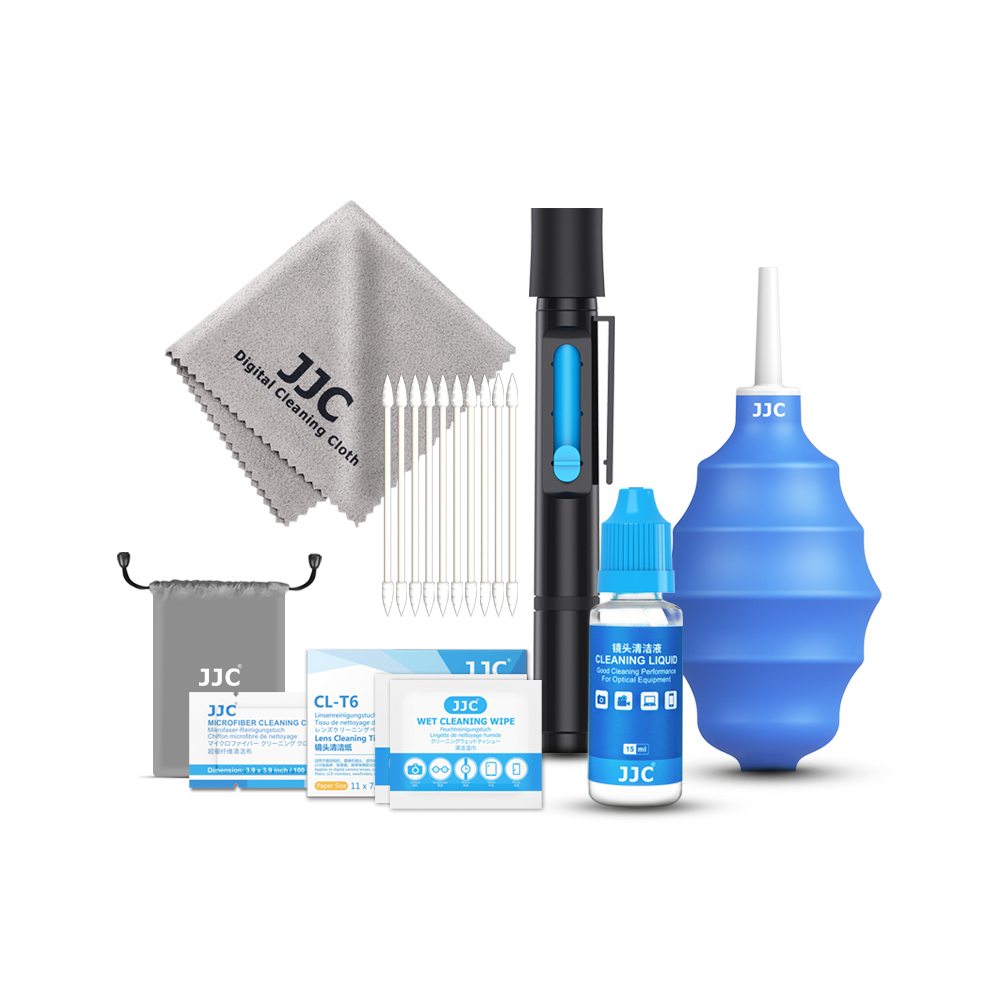 JJC CL-9 Cleaning Kit contains several items that can be used to keep your cameras, lenses, filters and other optics free from dust and dirt. Among them, the Lens Cleaning Liquid is safe and efficient. It has no corrosive chemicals and can clean your lens effectively. The Powerful Air-Blower is made of durable silicone, and a one-way valve on the bottom brings in clean air and does not re-distribute dust. The Lens Cleaning Pen has a retractable soft brush and two carbon cleaning tips. One tip is for lens cleaning while the other is for viewfinder and display cleaning. One Microfiber Cleaning Cloth for Digital Products is for cleaning computers, mobile phones, glasses, etc., it is quite soft and has an excellent cleaning effect. Besides, the cloth can be used repeatedly after being washed. Two Microfiber Cleaning Cloths for Lens, vacuum packaged, are specially designed for cleaning your lenses or filters. The number of Lens Cleaning Tissue in the package is up to 50 sheets. Wet Cleaning Wipes are convenient, safe and effective, applying to lenses, LCD screens, glasses and so on. 10 pieces of Pointed Tip Cotton Swabs are provided, too. The package also supplies a storage pouch for free for you to collect cleaning tools after using. JJC CL-9 Cleaning Kit will help you keep your camera in tip top shape.