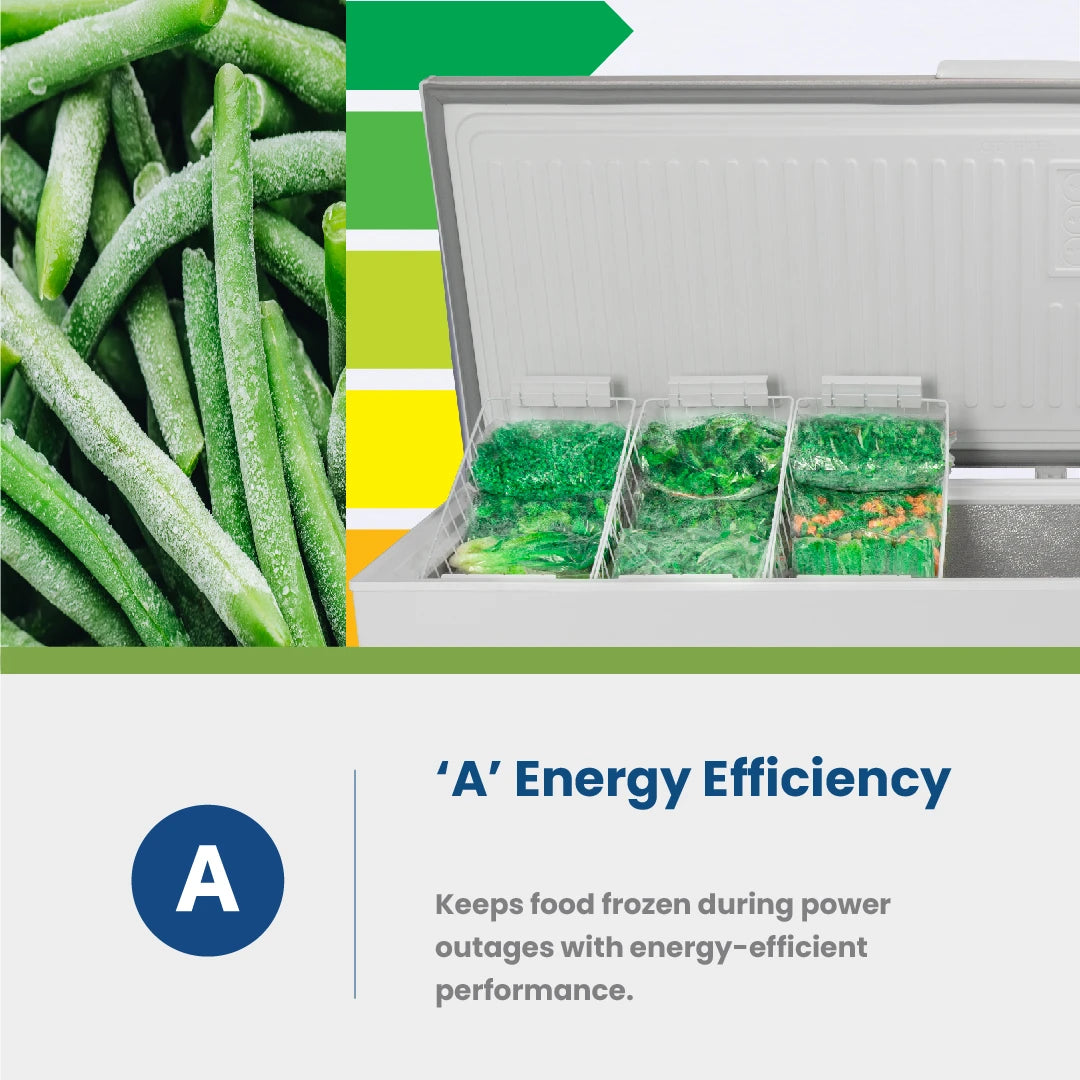 This Freezer with a massive 537L NETT storage space is one of the biggest in its category, and it safely keeps your food frozen for long during loadshedding. The thick lid and its A energy class save you money while keeping your food frozen for longer. Its aluminium inner tank is rust free and easy to clean.