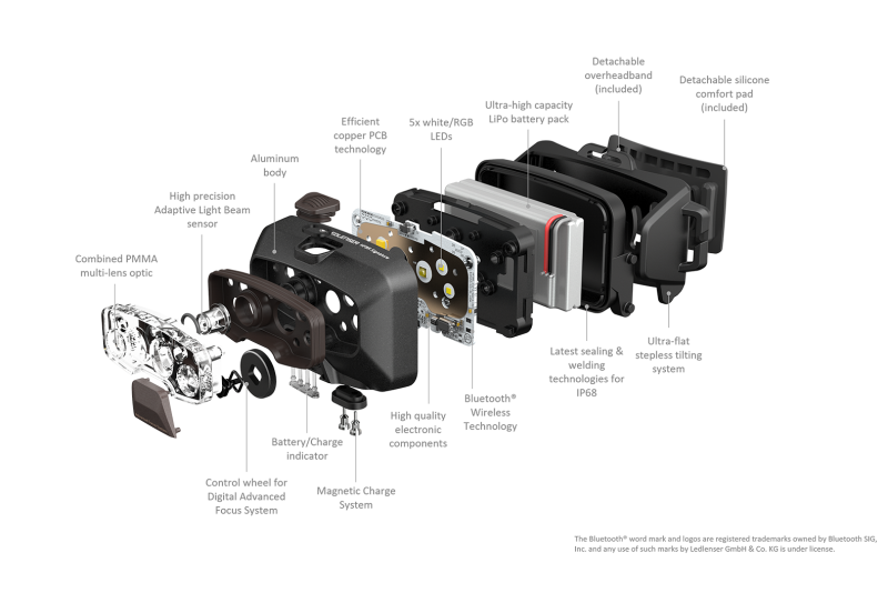 Numerous innovations and extreme luminosity combined: Our Ledlenser HF8R Signature is the ultimate high-end model for anyone in need of a headlamp for exceptional applications. Thanks to an efficient cooling system, the HF8R Signature is extremely powerful and offers perfect light at any time. Our Adaptive Light Beam Technology allows automatic dimming and focusing. Thus, the HF8R is our first headlamp which can be used hands-free and requires no manual control at all. Moreover, it comes with red, blue and green front light and allows virtually seamless focusing thanks to our patent-pending Digital Advanced Focus System. You can remotely control and personalize the HF8R Signature via Ledlenser Connect App. The reflective headband is another clever feature.