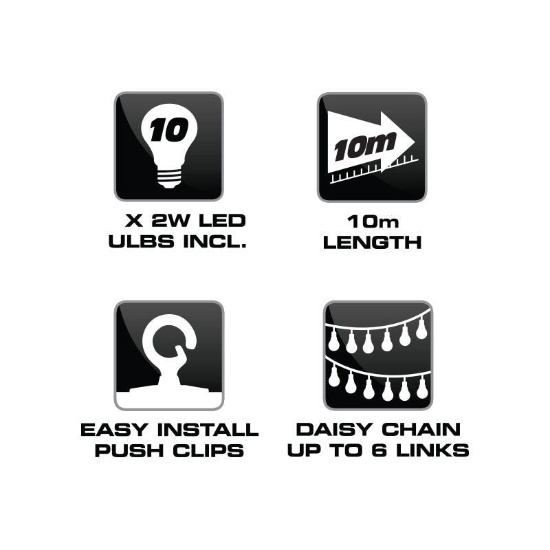 Create the perfect atmosphere for any occasion with Magneto String Lights! Indoor or outdoor? It’s your choice really... because these bulb string lights are weatherproof with an IP44 rating for protection in all weather conditions (including rain). Illuminate your garden, patio, or entertainment area with these durable outdoor string lights. They’re perfect for setting the mood and transforming night-time gatherings into elegant events. These LED lights on a string come standard with x10 sealed 2-Watt warm white bulbs as well as a durable 10 metre premium quality rubber cable. You can even link up to x6 multiple cables to cover a much wider area!
