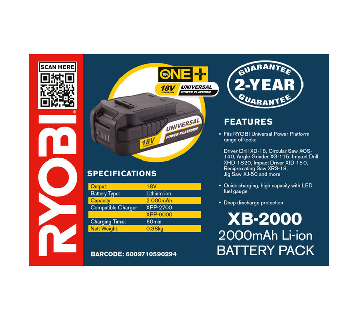 • RYOBI XB-2000 Li-Ion Battery Pack, 2000mAh, 18V, ensures your tools always stay charged.