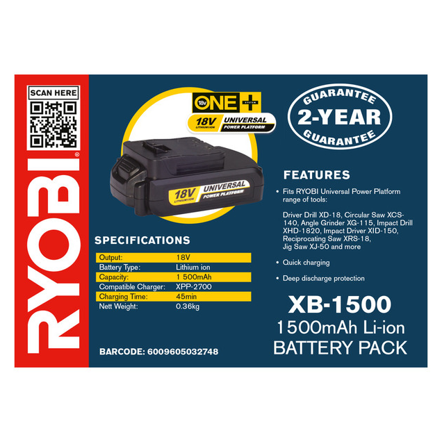 | Product Description | Ryobi Battery Pack 18.0V Li-Ion 1500mAh XB-1500 |