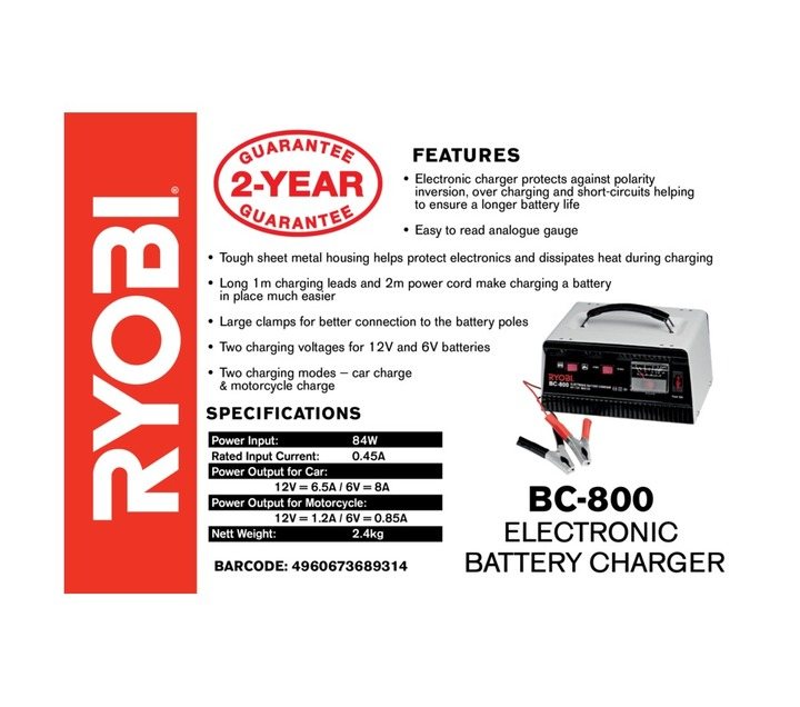 The Ryobi BC-800 8A Battery Charger is designed to offer reliable performance, safety features, and user convenience for both cars and motorcycles. Its durable construction, advanced protection features, and long power leads make it a great choice for anyone needing an efficient charging solution.