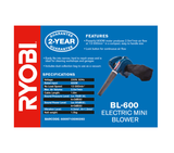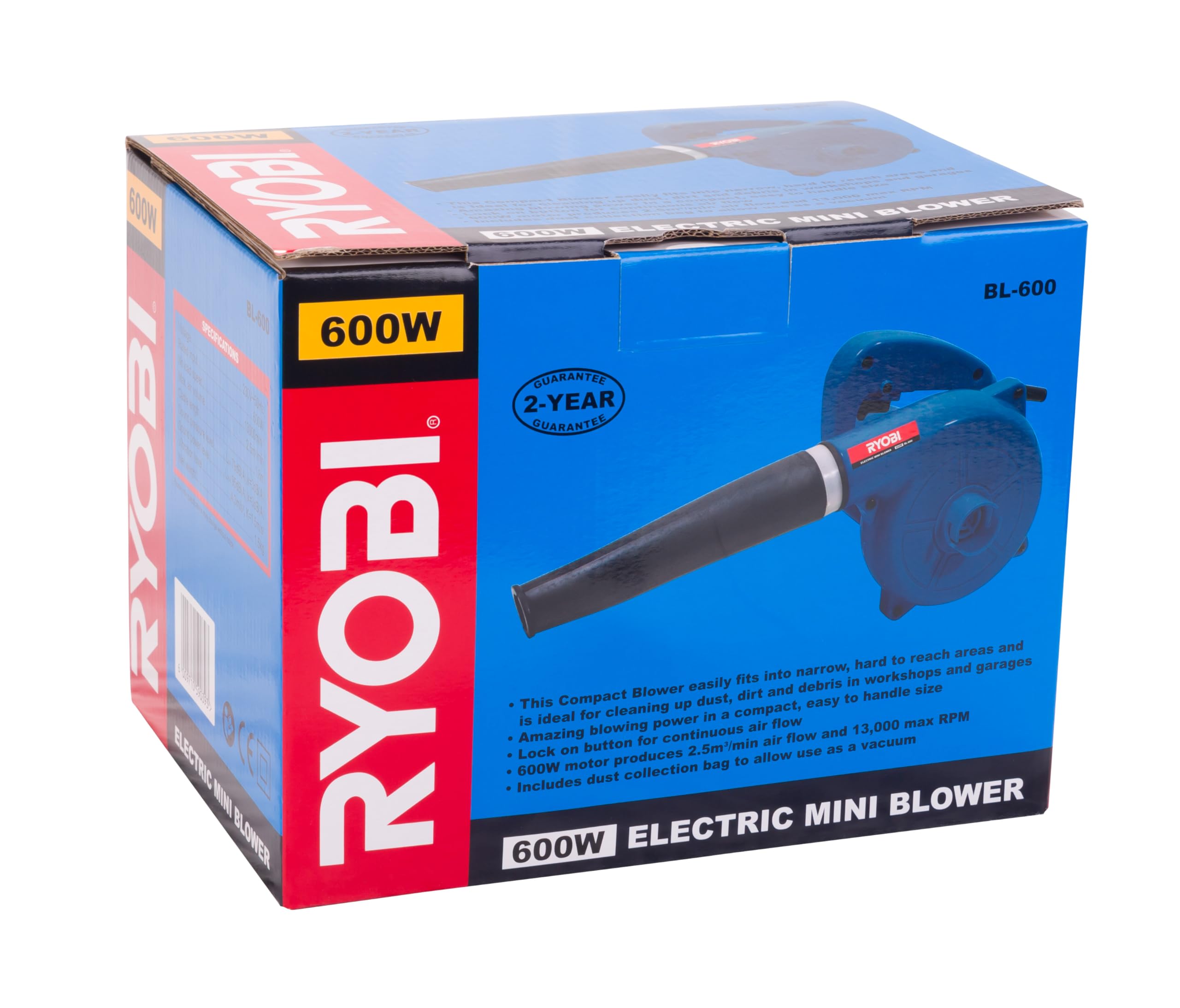 Brand Ryobi Product type Blowers Product Ryobi Mini Blower 600W BL-600 Appliance type Blower No-load speed 13000rpm Power input 600W Power supply Electric Dust collection Yes Application Commercial Residential Feature and Benefits • No load speed: 13 000min-1.• Max. air volume: 2.5m3/min.• Cable length: 1.8m.• Sound pressure level: Lpa...