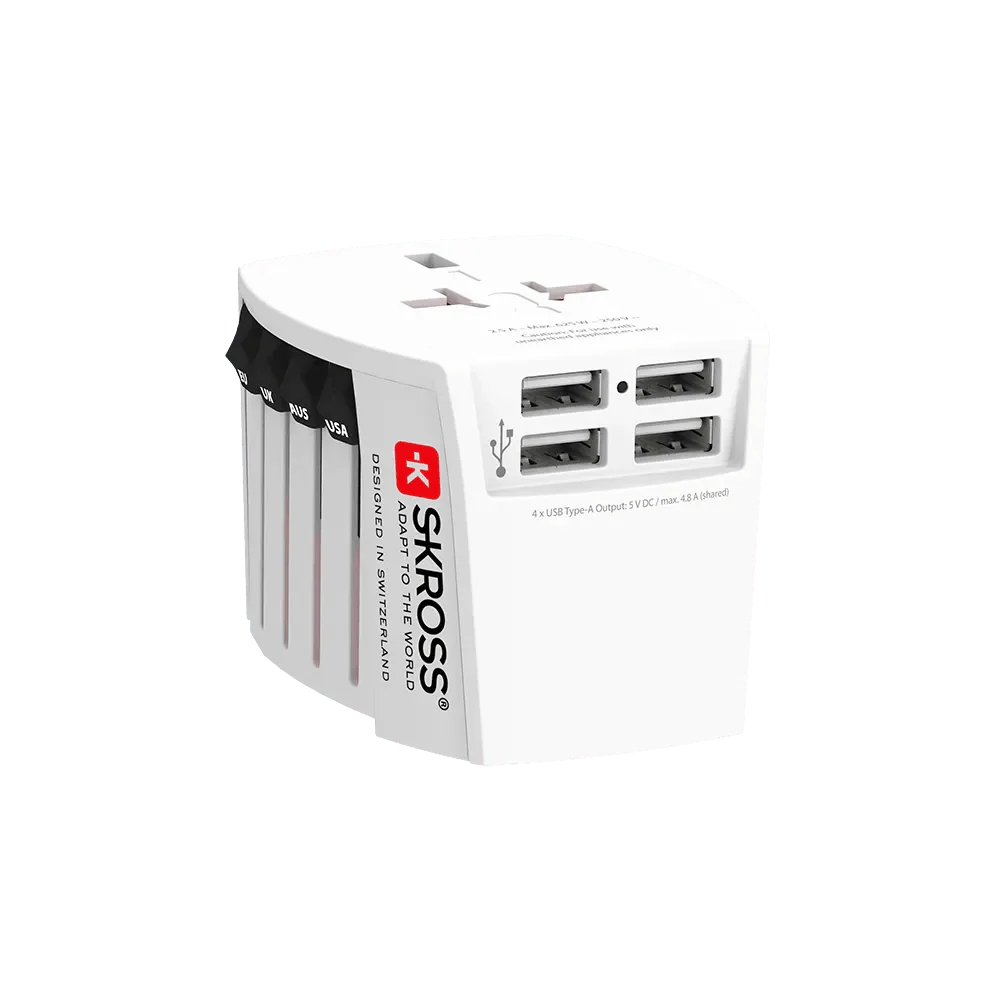 Travel smarter and charge everything from smartphones to tablets with the SKROSS MUV USB World Adapter. Equipped with four USB-A ports (total output up to 5 V / 4.8 A) and a universal mains adapter, this device lets you power up to four USB devices and one unearthed plug simultaneously—perfect for global travelers.