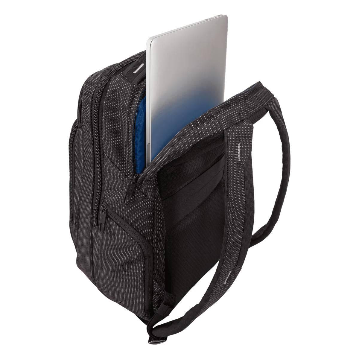 The backpack's crush-resistant SafeZone pocket is perfect for fragile items while the PowerPocket organizes your cords and makes it easier to charge your electronics on the go. Protect your personal information from theft with the RFID-blocking pocket and store your 14" laptop and 10.1" tablet in the two thickly padded compartments. Thule Crossover 2 laptop backpack is designed with weather-resistant, lightweight materials – all with a sleek and professional finish.