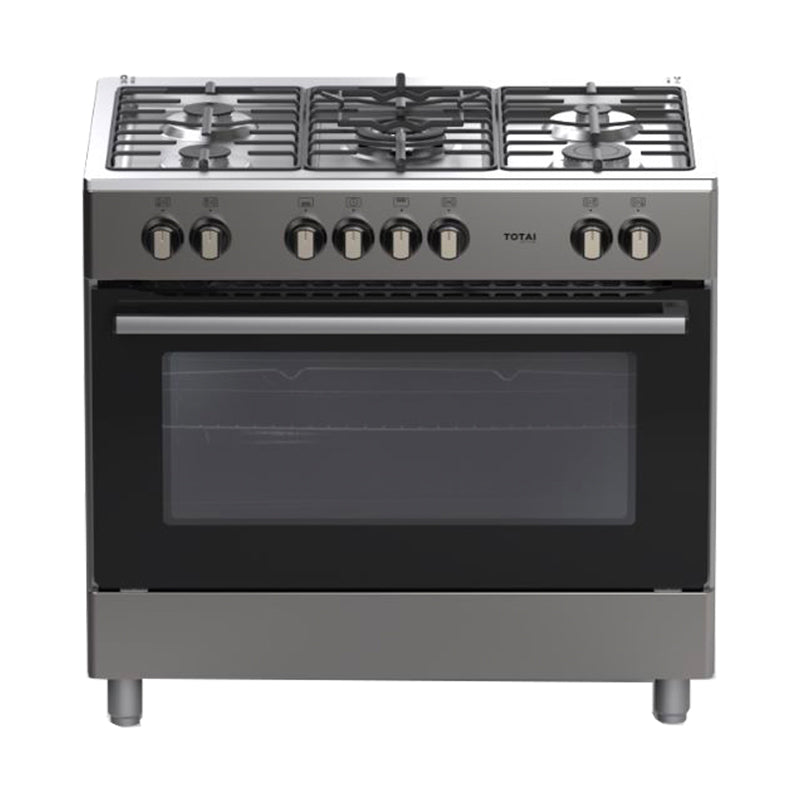 TOTAI TS 90CM 5 BURNER FULL GAS STOVE- STAINLESS STEEL 5 Gas Burners & Gas Oven Stainless steel body – Glass oven door Adjustable legs Cast Iron Grids Auto Ignition Flame failure device 90 min manual timer 1 X oven rack 1 X oven tray Gas Grill Gas Oven Thermostat...