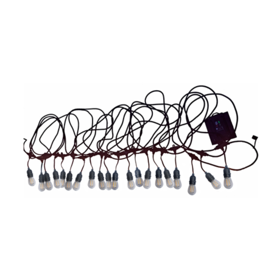 Includes: 20 x Bulbs, 1 x 20m cable with fittings, 1 x Battery Solar Box, 1 x Screw Mount, 1 x Ground Mount, 1 x Clamp Mount, 1 x Bag Features: 20 x LED Bulbs S14, Double Strip, Warm White Reverse Thread Bulb Power: 1.2W each, Total Power 24W Brightness:...
